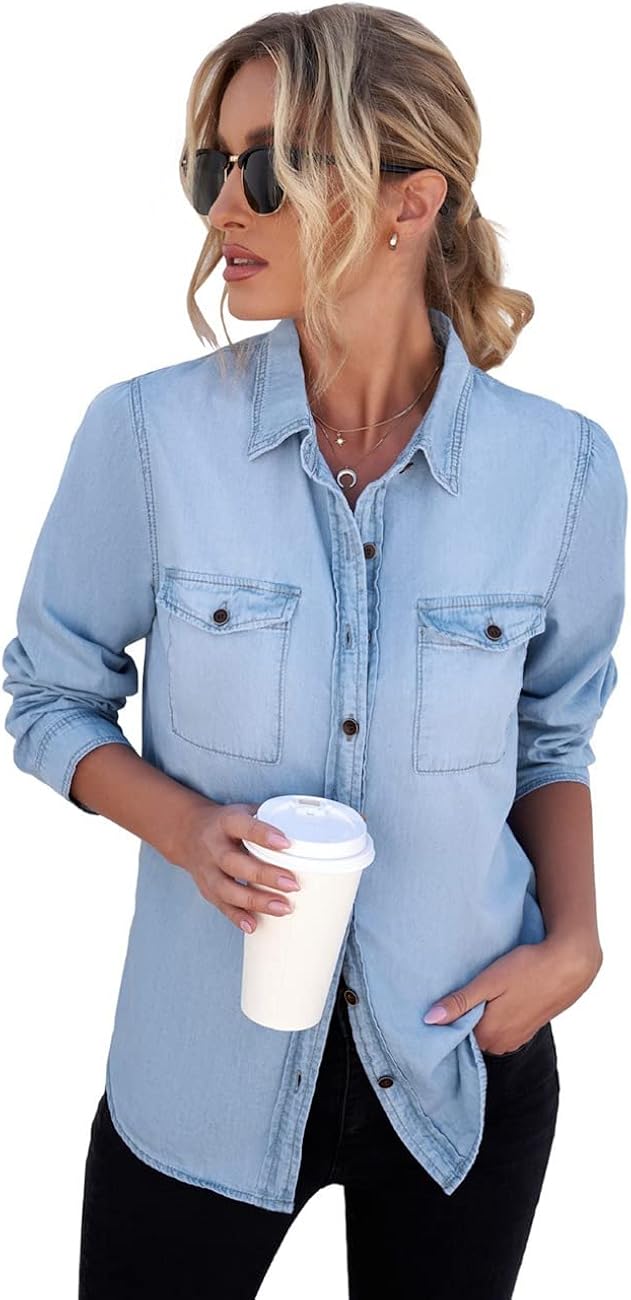 Denim Button closure Women denim shirt comes with collared v neck and two spade pockets design. Relaxed fit tops. Long sleeve tunic tops with functional button at the cuffs. Casual button down shirt for women. Spread Collar. Work Office Shirt Blouse. Classic and vintage blouse for ladies. Suitable for spring, fall, winter. Styled this fall tops with ripped jeans pants or leggings for your fashion ensemble. Size Small fits size 4 - size 6, size Medium fits size 8 - size 10, size Large fits size 12 - size 14, size X-Large fits size 16 - size 18, size XX-Large fits size 20 - size 22.